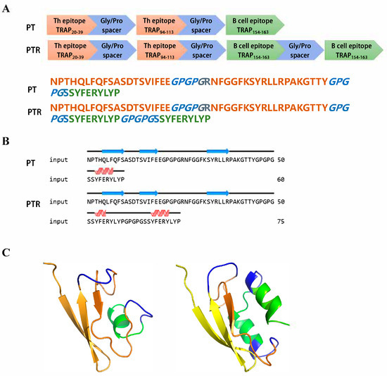 Based on the above results and previous reports, selected epitopes were joined using specific linker sequences to design a vaccine construct. The amino acid sequence of one recombinant epitope-based vaccine (named PT) was designed to include the three selected epitope peptides (TRAP20–39, TRAP94–113, and TRAP154–163) described above, while the glycine/proline spacer sequence (GPGPG) of another epitope-based vaccine (named PTR) was repeated with one B cell epitope (154–163) (Figure 5A). The GPGPG spacer was chosen for its flexibility and hydrophilic properties, which minimize steric hindrance between epitopes and prevent the formation of junctional immunogenic sequences, thereby preserving the structural integrity and immunogenicity of individual epitopes. Protein secondary structure prediction suggested that epitope-based vaccines contained β-strands and α-helix (Figure 5B). A 3D model of the proposed vaccine was predicted in the 3Dpro webserver (Figure 5C).