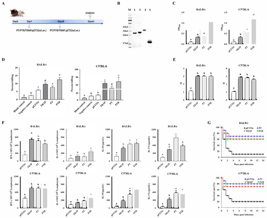 Peritoneal macrophages were isolated from thioglycolate-elicited mice, adjusted to 1 × 106 cells/mL in DMEM supplemented with 10% FCS, and cultured for 24 h. S. aureus Newman (5 × 106 CFU) was opsonized with 10 μL of heat-inactivated sera from PT-, PTR-, TRAP-, or pET32a (control)-immunized mice for 30 min at 37 °C. Opsonized bacteria were co-incubated with macrophages at a multiplicity of infection of 5:1 for 90 min. After washing to remove extracellular bacteria, macrophages were lysed with sterile water, and surviving intracellular bacteria were quantified via serial dilution plating on TSA. Killing was characterized by the percentage of CFU in wells with co-cultures of phagocytic cells alongside microorganisms, in comparison to the percentage in wells containing only microorganisms.
