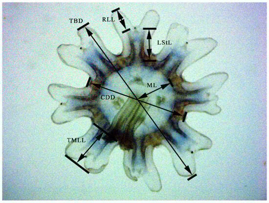The samples were obtained from coastal waters near Ningbo (29°38′51″ N 121°46′43″ E) and Taizhou (121°37′48″ E 28°43′12″ N) in October 2018 and June 2023, respectively (Figure 1). The adult medusae were photographed in situ before sampling and dissected in the field; some tissues were stored in 75% ethanol, and the remainder were stored in a 5% formaldehyde solution. The polyps were collected and transported to the laboratory in a 1 L glass beaker at 20 ± 1 °C for 24 h in darkness. Then, the polyps were cultured in a 700 L tank at 25 ± 1 °C with dissolved oxygen > 5 ppm, pH 7.7–8.1, salinity 29.0–31.0, total ammonia < 0.05 mg/L, nitrite < 0.05 mg/L, 9 h of light and 15 h of darkness. The polyps and ephyrae were photographed via a stereoscopic microscope (Jiangnan-JSZ6S) connected to an industrial digital camera (UCMOS05100KPA) (Nanjing Jiangnan Novel Optics Co., Ltd., Nanjing, China), and the strobila, young and adult medusae were photographed with an Olympus TG5 camera (Olympus Corporation, Tokyo, Japan). Additionally, we randomly sampled and measured the dimensions of ephyrae, the measuring points contains total body diameter (TBD), central disk diameter (CDD), lappet stem length (LStL), rhopalial lappet length (RLL), manubrium length (ML) and total marginal lappet length (TMLL) of ephyrae (measured within 24 h after detachment) (see Figure 2) [13,14]. The holotype and paratype were preserved at the Yuren Museum and the Third Institute of Oceanography, MNR, China (code NB2023003—NB2023007, TIO—SRMP001, and TIO—SRMP002).