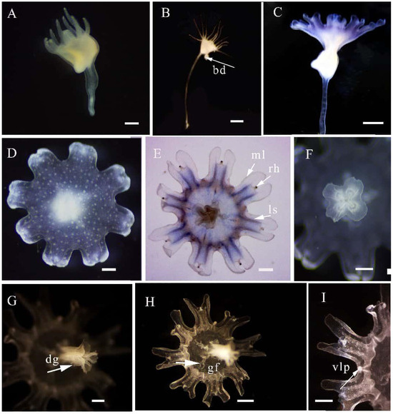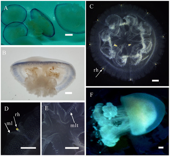 - Lucas, C.H.; Graham, W.M.; Widmer, C. Jellyfish life histories: Role of polyps in forming and maintaining scyphomedusa populations. Adv. Mar. Biol. 2012, 63, 133–196. [Google Scholar] [CrossRef] [PubMed]