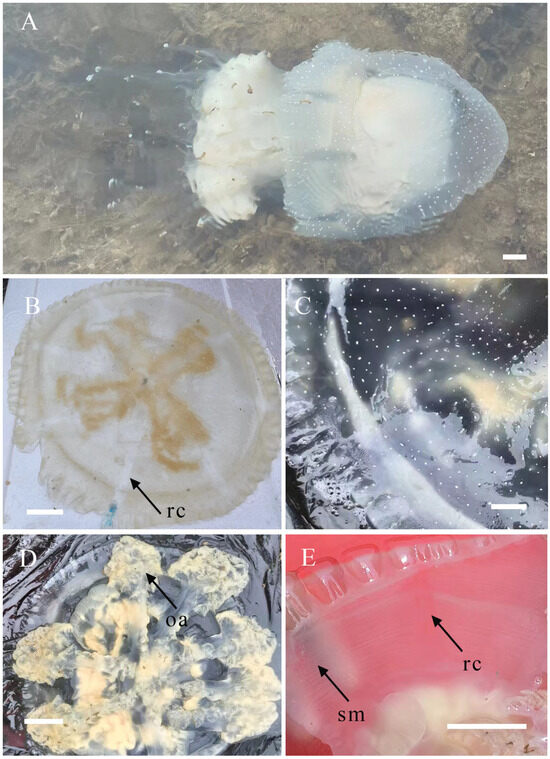 Phyllorhiza luzoni stands out from its congeners due to its broad, flat exumbrella featuring a delicately granular texture. The exumbrella is dotted with white spots that are more irregular, numerous, and larger towards the periphery than at the center. This species has a green hue and possesses small appendages on its mouth arms. Phyllorhiza luzoni is native to Varadero Bay in southern Luzon and the Philippine islands [40,41]. In contrast, the new species is distinguished by its hemispherical umbrella and pristine white coloration, and it was found in the East China Sea.