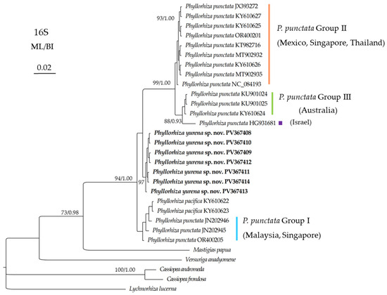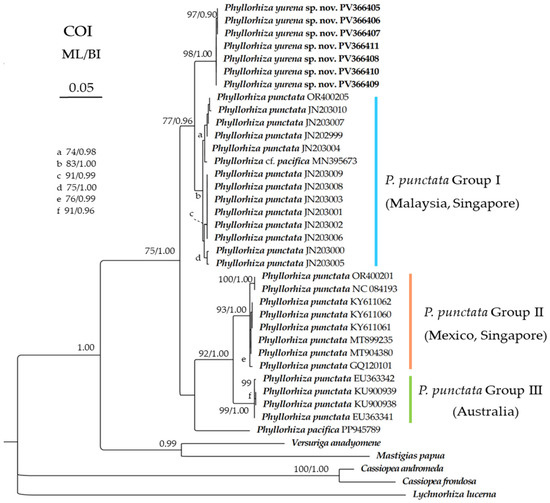 The 16S marker appears to mirror the COI gene in terms of genetic distance patterns (Table 5). However, due to the lack of detailed morphological data, the identification of Group I remains uncertain. Moreover, effective genetic thresholds for COI and 16S have yet to be determined for the genus Phyllorhiza. Therefore, to optimize the DNA barcoding framework for Phyllorhiza, additional data, including both conspecific and congeneric sequences with accurate morphological identification, are urgently needed.
