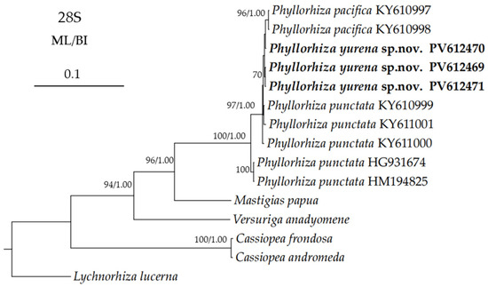 | Phyllorhiza yurena sp. nov. | TIO-SRMP001 | East Sea of China | PV366411 | PV367414 | PV613531 | PV612471 | present study |