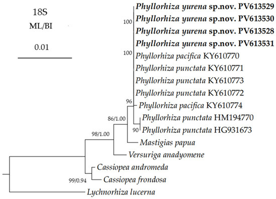 Based on the 18S aligned regions, the genetic distances among Phyllorhiza spp. were extremely low, with values ranging from only zero to 0.12% (Table 7). Similarly to the 28S trees, the new species was nested within the Phyllorhiza clade, but its phylogenetic position remained unresolved due to little variation among the congeners (Figure 9).