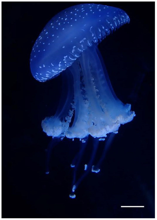- Collins, A.G.; Morandini, A.C.; Cartwright, P. World List of Scyphozoa. Phyllorhiza Agassiz. 1862. Accessed Through: World Register of Marine Species. Available online: https://www.marinespecies.org/aphia.php?p=taxdetails&id=135256 (accessed on 6 March 2025).