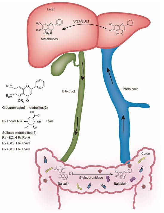 - Xing, J.; Chen, X.; Zhong, D. Absorption and enterohepatic circulation of baicalin in rats. Life Sci. 2005, 78, 140–146. [Google Scholar] [CrossRef]