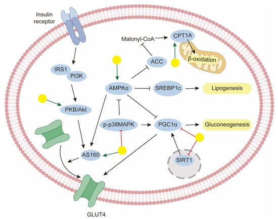 | Non-alcoholic steatohepatitis | Decreases lipid accumulation | ↓ SREBP-1c and fatty acid synthase ↑ Fatty acid oxidation enzymes, includingPPARα and CPT1a | [55] | |