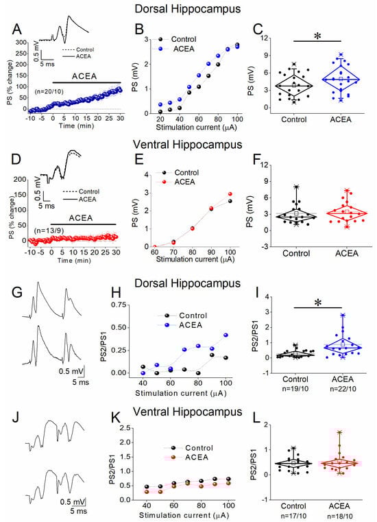3.2. ACEA Enhances Network Excitation and Reduces PPI in the Dorsal but Not the Ventral Hippocampus