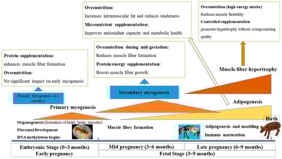 Critical windows of fetal development and the impact of maternal nutrition during pregnancy. This timeline illustrates key stages of embryonic and fetal development, highlighting periods of primary and secondary myogenesis, adipogenesis, and muscle fiber hypertrophy. MO and supplementation at different stages affect muscle and fat development. Early protein supplementation enhances muscle fiber formation, while MO in late gestation promotes intramuscular fat deposition and marbling. Controlled supplementation ensures optimal growth, balancing muscle development and fat accumulation.