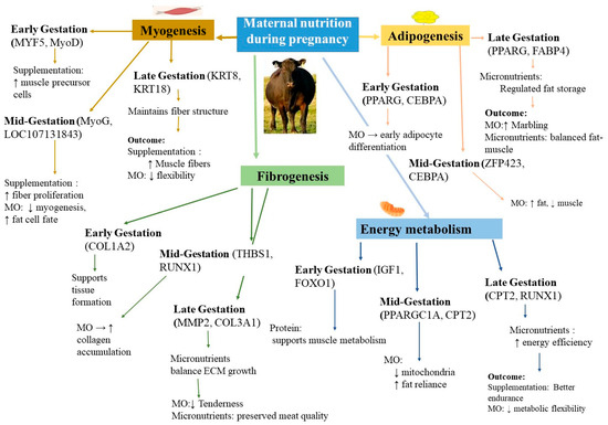 The effects of MO on fetal gene expression are well-documented, but a mechanistic synthesis is still needed to understand how these prenatal changes affect postnatal physiology. MO during gestation alters fetal gene expression in skeletal muscle, adipose, connective tissue, and energy metabolism (Table 1). These changes shape growth potential, carcass traits, metabolic efficiency, and long-term health.