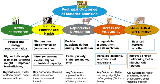 The developmental origins of health and disease framework posits that prenatal conditions, particularly maternal nutrition, have enduring effects on offspring growth, health, and overall productivity. The concept of fetal programming, introduced by Barker [7], underlines that poor gestational nutrition, whether deficient or excessive, can cause permanent changes in offspring metabolism, organ function, and disease susceptibility. In beef cattle, fetal programming is most evident in postnatal growth and carcass traits. Nutrient imbalances during key gestational periods often result in reduced growth, lower carcass quality, and impaired reproduction [8,49].