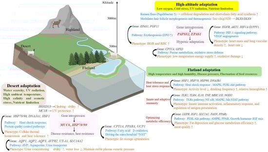 From genes to phenotypes: genetic mechanisms of adaptation to plateaus, plains and deserts. Arrows in the graph indicate an increase or decrease in genes or phenotypes.