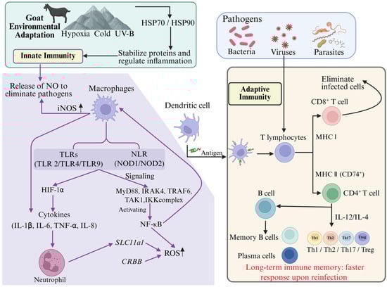 The immune system, as a crucial defense network for animals to cope with environmental challenges, plays a key role in goat responses to various ecological stresses. The immune response in animals is primarily mediated by both innate immunity and adaptive immunity. Innate immunity involves pathogen recognition receptors (such as Toll-like receptors (TLRs) and NOD-like receptors (NLRs)) that detect invading pathogens and activate rapid immune responses. In contrast, adaptive immunity primarily relies on the activation of B cells for antibody production and the differentiation and activation of T cells []. T cell receptors (TCRs) and helper T cells (Th cells) are involved in T cell-dependent immune responses. TCRs, which are specific receptors on T cell surfaces, primarily recognize specific antigens, while specialized Th cells are responsible for regulating and coordinating immune responses []. These two immune mechanisms work together through a complex signaling network, enhancing the goat’s ability to survive under different environmental pressures.