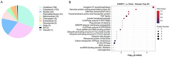 Analysis of differentially ubiquitinated protein subcellular localization and domain enrichment. (A) A pie chart displaying the number of proteins associated with differentially ubiquitinated peptides in each subcellular organelle. (B) Bubble diagram showing the enrichment analysis of protein domains with differential ubiquitination. The vertical axis represents the statistical results of differentially ubiquitinated proteins under each domain classification. The horizontal axis indicates the significance of the enriched domain classifications, derived from the p values calculated using Fisher’s exact test (expressed as −log10). The size of the bubbles corresponds to the number of differentially ubiquitinated proteins annotated to that domain classification, while the color of the bubbles represents the enrichment factor (Rich Factor ≤ 1).