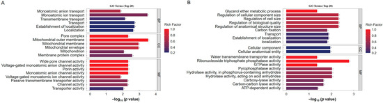 GO annotation analysis of differentially ubiquitinated proteins. (A) GO enrichment analysis of proteins with upregulated ubiquitination-modified levels following ToBRFV infection. (B) GO enrichment analysis of proteins with downregulated ubiquitination-modified levels after ToBRFV infection. The vertical axis represents the secondary GO functional categories, including biological processes, cellular components, and molecular functions. The horizontal axis indicates the significance of enrichment, based on the p value from Fisher’s exact test (expressed as −log10). The numbers next to the bars represent the number of differentially ubiquitinated proteins annotated to that GO functional category. The color of the bars indicates the enrichment factor (Rich Factor ≤ 1).