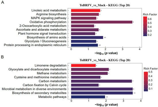 KEGG annotation analysis of differentially ubiquitinated proteins. (A) KEGG enrichment analysis of proteins with upregulated ubiquitination-modified levels following ToBRFV infection. (B) KEGG enrichment analysis of proteins with downregulated ubiquitination-modified levels after ToBRFV infection. The vertical axis represents the KEGG pathway entries enriched with differentially ubiquitinated proteins, while the horizontal axis indicates the significance of enrichment, which was calculated based on the p value from Fisher’s exact test (expressed as −log10). The numbers next to the bars represent the number of differentially ubiquitinated proteins annotated to that KEGG pathway entry. The color of the bars indicates the enrichment factor (Rich Factor ≤ 1).