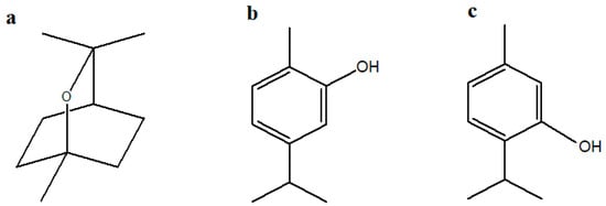 Chemical structures of monoterpenes created using ChemDraw Pro (version 8.0): (a) Cineole; (b) Carvacrol; (c) Thymol.