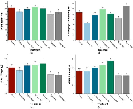 Effect of major compounds (cineole, carvacrol, and thymol) at two concentrations (500 and 1000 ppm) on plant height (a), chlorophyll content (b), fresh weight (c), and aerial biomass (d) of chickpea plants (Cicer arietinum L.). Values are presented as means ± SE (n = 6). Within each parameter, values followed by different letters differ significantly (p < 0.05) according to Tukey’s post hoc test.