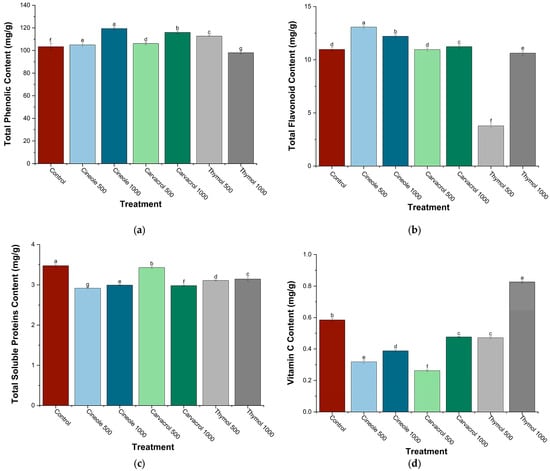 Total phenolic (a), flavonoid (b), soluble protein (c), and vitamin C (d) contents (mg g−1) in chickpea plants treated with major monoterpenes (cineole, carvacrol, and thymol) at two concentrations (500 and 1000 ppm). Data are presented as means ± SE (n = 6). Bars labeled with different letters indicate significant differences (p < 0.05) according to Tukey’s post hoc test.