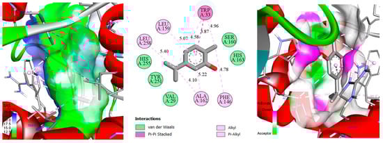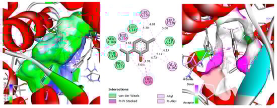 In the 3D representation of thymol binding to ascorbate peroxidase (Figure 4), the active-site surface is colored according to the solvent-accessible surface (SAS) and hydrogen-bond donor/acceptor potential []. Predominantly green regions within the binding pocket indicate extensive hydrophobic or slightly apolar interactions surrounding thymol. In contrast, localized blue or mauve patches highlight polar zones capable of hydrogen bond formation. This surface distribution reinforces earlier observations that aromatic and alkyl interactions (π-π stacking, π-alkyl, and van der Waals) primarily stabilize the complex. Nevertheless, the limited polar surfaces suggest that indirect hydrogen bonding via structured water molecules or weak dipoles may occur with thymol’s hydroxyl group. The dominance of green hydrophobic surfaces complements and confirms the molecular interaction analysis, underscoring the central role of hydrophobic and aromatic interactions in anchoring thymol, while also indicating potential synergy with minor polar interactions.