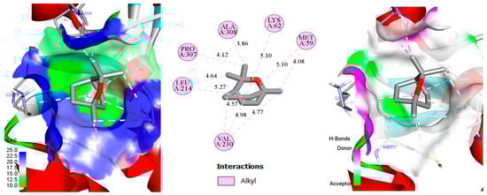 In the combined 2D and 3D depiction (Figure 6) of cineole interacting with protochlorophyllide reductase (PDB: 6L1H), analysis reveals ten alkyl-type contacts involving residues Ala A308, Lys A62, Met A59, Val A210, Leu A214, and Pro A307 at distances ranging from approximately 3.86 to 5.27 Å, indicative of significant hydrophobic interactions []. These interactions, primarily concentrated around the ether ring and apolar side chains of protein residues, contribute to the relatively negative docking score (−6.1 kcal/mol), signifying notable binding affinity. In the 3D view, the solvent-accessible surface (SAS) map predominantly exhibits blue coloration, suggesting a largely polar environment with regions potentially receptive to water molecules or dipolar interactions. Despite this overall polarity, discrete green hydrophobic pockets accommodate cineole, allowing for effective alkyl interactions that stabilize the ligand. Although direct hydrogen bonds (H-bonds) are rare or absent, indirect bonding via structured water molecules could further enhance ligand binding in certain conformations. Thus, the balance between polar and hydrophobic areas within the binding pocket, combined with cineole’s apolar geometry, results in a stabilizing interaction: robust alkyl contacts firmly anchor the ligand, while the polar pockets may facilitate selective solvation and recognition. Collectively, these factors elucidate the docking score (−6.1 kcal/mol) and emphasize the chemical and spatial complementarity between cineole and protochlorophyllide reductase.