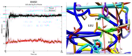 Through molecular dynamics, we precisely monitored the evolution of interactions between thymol and key residues within the enzyme’s active site, focusing on hydrophobic and aromatic contacts (Leu159, Ala162, His163, Trp33) previously highlighted by docking analyses. Over the 100 ns simulation, detailed analyses confirmed the sustained stability of the complex, thereby supporting initial theoretical predictions and experimental data. Specifically, root mean square deviation (RMSD) analysis showed that thymol rapidly stabilized after approximately 10 ns, maintaining minimal fluctuations with an average RMSD value of about 5 Å (0.5 nm) until the end of the simulation (Figure 7). Simultaneously, the protein backbone exhibited remarkable conformational stability, reflected by an RMSD consistently near 1 Å (0.1 nm) throughout the simulation, underscoring the structural robustness of the thymol–ascorbate peroxidase complex [].