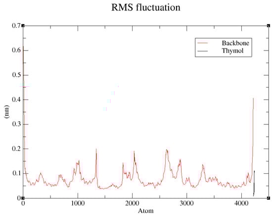 RMS mean square fluctuation (RMSF) analysis of backbone atoms in the thymol–1IYN complex during the 100 ns molecular dynamics simulation.