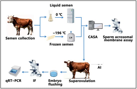 The study design is shown in Figure 1. First, we collected semen from five bulls. The collected semen was processed and then preserved in either liquid nitrogen or at 0 °C for 24 h. Subsequently, computer-assisted analysis and assessment of the integrity of the acrosomal membrane were conducted. Following this, artificial insemination was performed. On the 7th day after artificial insemination, embryo flushing was carried out, followed by the immunofluorescence observation of the embryos and detection of genes related to proliferation and apoptosis.