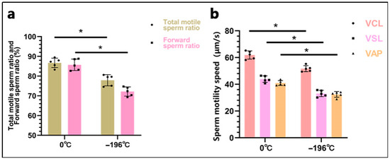 Results of computer-assisted sperm analysis. In the figure. (a), Displays the proportion of total motile sperm and progressively motile sperm. (b), Displays the sperm motility parameters, including VCL, VSL, and VAP. “0 °C” denotes the 0 °C-refrigerated sperm group, and “−196 °C” represents the liquid nitrogen-frozen sperm group. The asterisk (*) indicates significant differences between the two groups (p < 0.05).