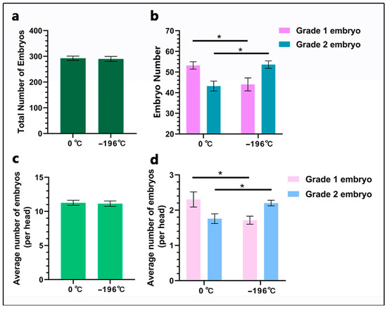 The results of non-surgical embryo recovery are illustrated in Figure 5. Total embryo counts showed no significant divergence between the 0 °C cohort (292.6 ± 3.7) and the −196 °C group (289.8 ± 4.3; p ≥ 0.05; Figure 5a). Notably, the 0 °C group yielded a substantially greater number of Grade 1 embryos (53.20 ± 1.78, 54.2% of total) compared to the −196 °C group (44.00 ± 3.16, 45.2% of total; p < 0.05). In Grade 2 embryos, the opposite trend was observed: the 0 °C group yielded significantly fewer embryos (43.20 ± 2.38, 44.3% of total) compared to the −196 °C group (53.60 ± 1.81, 54.5% of total; p < 0.05; Figure 5b). The mean embryo count per individual cow showed no significant difference between groups: 11.71 ± 1.35 (0 °C) versus 11.54 ± 1.46 (−196 °C; p ≥ 0.05; Figure 5c). Embryo quality exhibited pronounced contrasts: the 0 °C group displayed higher individual cow counts of Grade 1 embryos (2.13 ± 0.35 vs. 1.76 ± 0.26 in the −196 °C group; p < 0.05) while demonstrating reduced individual cow counts of Grade 2 embryos (1.73 ± 0.18 vs. 2.14 ± 0.22 in the −196 °C group; p < 0.05; Figure 5d).