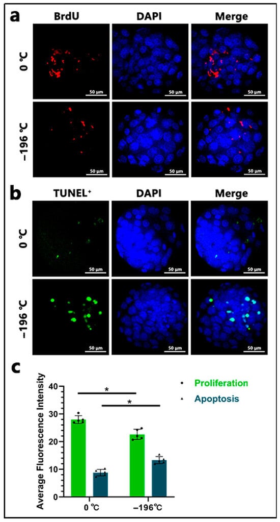 Proliferating cells within the embryos were stained red using BrdU (Figure 6a), while apoptotic cells were stained green using TUNEL (Figure 6b). Statistical analysis indicated that the fluorescence intensity of proliferating cells in the 0 °C group (27.96 ± 1.40) was significantly higher than that in the −196 °C group (22.59 ± 1.85) (p < 0.05). Conversely, the fluorescence intensity of apoptotic cells in the 0 °C group (8.79 ± 1.16) was significantly lower than that in the −196 °C group (13.30 ± 1.29) (p < 0.05) (Figure 6c).