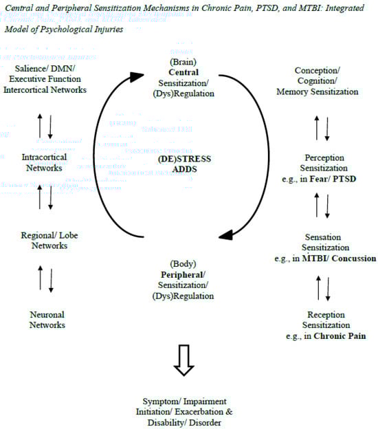 The present model of central/peripheral sensitization as a common mechanism in psychological injuries adds to prior models by indicating the following. The model focuses on (a) a broad range of loci of sensitizations (e.g., reception, sensation, perception, conception), (b) a broad range of conditions (e.g., not just chronic pain but also PTSD and MTBI/concussion, and here we can add their comorbidities in polytrauma and related disorders, e.g., substance abuse disorder and depression), (c) hierarchical levels of explanation/causation (e.g., (i) a top–down level in the biopsychosocial model of compendium of factors, which includes patient perception and (ii) a bottom–up level of activation/inhibition coordination), (d) a detailed description of the neurobiology involved in the major psychological injuries that was undertaken as part of the literature review above, and (e) potential new avenues in instigating therapeutic change mechanisms (e.g., any relevant component of the broad biopsychosocial array, the specific activation–inhibition coordination, and increasing psychological reserve/control).