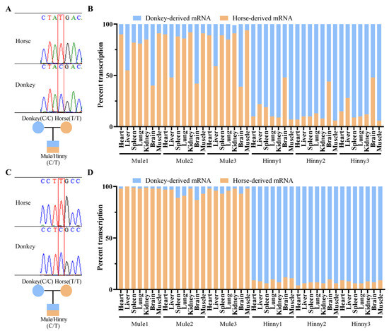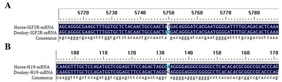 Reference mRNA and DNA sequences of Igf2r (for DNA: NCBI Accession NC_091714 for horse and NW_014638170 for donkey; for mRNA: NCBI Accession XM_005608119.4 for horse and XM_044760750.2 for donkey) and reference mRNA of H19 (NCBI Accession: NR_027326.2 for horse; NCBI Accession: XM_014830185.1 for donkey) were aligned using BioEdit 7.0.9 to identify interspecies SNVs. Figure 1A,B show the SNVs from a comparison of Igf2r and H19 mRNA sequences between horses and donkeys.