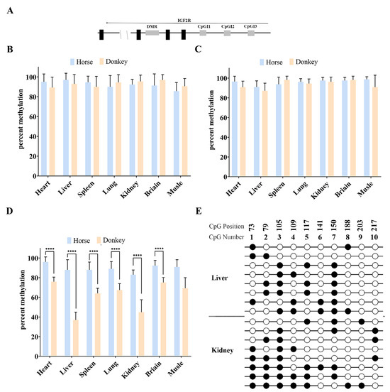 Bisulfite and Sanger sequencing were performed on DNA from the horse and donkey tissues. The results showed that CpG islands (CpGIs) 1 and 3 in the Igf2r promoter region were all hypermethylated (66.7–100% methylation) without differential DNA methylation in the parent of origin (Figure 3A–C). Species-specific hypermethylation differences were observed in the CpGI2 region, but hypermethylation was maintained in the horse tissues, and tissue-specific hypermethylation differences were observed in the donkey tissues, demonstrating that DMRs were not present in the horse promoter region (Figure 3D). Further assays in the donkey liver and kidney tissues showed that the donkey promoter region was also free of DMRs (Figure 3E).