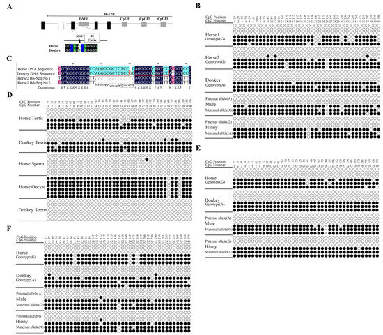Studies on the heart tissues of horses, donkeys, mules, and hinnies revealed a maternal allele-specific DMR in the intron 2 region of Igf2r in equines (Figure 4A,B), and this DMR remained unaltered by a 14 bp deletion in the horse (Figure 4B,C). Subsequent studies on testicular tissues and germ cells (sperm hypermethylation: 0.42 ± 0.1%; oocytes: 95 ± 0.1%) revealed that the DMR in the Igf2r intron 2 region was a gametic DMR (Figure 4D) and persisted in the liver and brain tissue (Figure 4E,F). A collective analysis of these results indicated the presence of a maternal allele-specific DMR in the intron 2 region of Igf2r in equids, which does not regulate the imprinted expression of Igf2r.