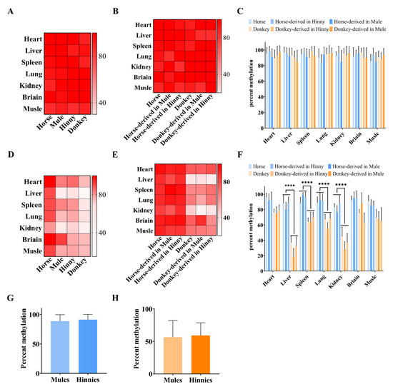 DNA methylation cis-acting inheritance of Igf2r in promoter CpGI2 in equines. (A) DNA methylation rates of seven equine tissues (heart, liver, spleen, lung, kidney, brain, and muscle) in CpGI1. (B) DNA methylation rates in CpGI1, and DNA methylation in hybrid tissue traced back to parents using SNV information. (C) Bar chart: DNA methylation rates in CpGI1. (D) DNA methylation rates in CpGI2, tending towards the result of horse > hybrids > donkey. (E) DNA methylation rates in CpGI2. (F) Bar chart: DNA methylation rates in CpGI2, (****: p < 6.46 × 10−7). (G) DNA methylation rates of horse-derived alleles of Igf2r in CpGI2 in hybrid tissues. (H) DNA methylation rates of donkey-derived alleles of Igf2r in CpGI2 in hybrid tissues. n = 3.