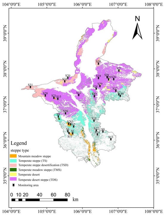 Vegetation sampling was conducted using the random sampling methodology, with a minimum distance of 50 m between quadrats. Within each monitoring area, three 1 m × 1 m quadrats (10 m × 10 m for shrub communities) were randomly established. A total of 9 quadrats were established in temperate meadow steppe, 33 in temperate steppe, 45 in temperate desert steppe, and 9 in temperate steppe desert areas. The following vegetation parameters were recorded: species composition, plant height, coverage (measured by needle point method), and frequency (determined by quadrat circle method). All vegetation within each quadrat was clipped and transported to the laboratory for aboveground biomass measurement.