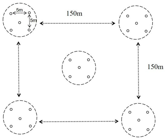 During the same period, five soil samples (0–20 cm depth) were randomly collected using the five-point sampling method around each plot where tenebrionid beetles were captured (Figure 2). These subsamples were immediately composited into one representative sample for physicochemical analysis, including organic matter, available potassium, total phosphorus, available phosphorus, soil pH, and alkali hydrolysable nitrogen; undisturbed soil cores (0–10 cm depth) were collected using soil cores for measurement of soil bulk density, field water holding capacity, saturated water holding capacity, capillary water holding capacity, capillary porosity, non-capillary porosity, and total porosity.