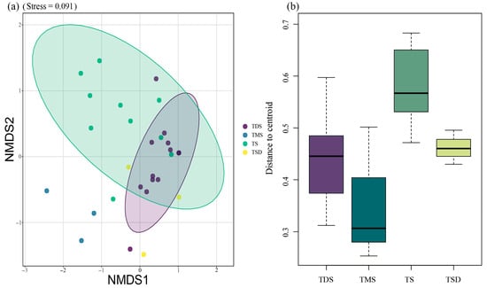 Differences in tenebrionid beetle community composition across four grassland types based on NMDS and PERMDISP analysis. Note: (a) Visualization of community dissimilarities, where dashed lines represent confidence ellipses for the four grassland types and dots indicate monitoring points within each grassland type. TDS is temperate desert steppe, TMS is temperate meadow steppe, TS is temperate steppe, and TSD is temperate steppe desert (the same abbreviations apply throughout the text). (b) The “Distance to centroid” represents the centroid distance of dissimilarity for tenebrionid beetle communities across four grassland types. The box plot illustrates the data distribution range, with the central line inside the box denoting the median (Q2), reflecting the central tendency of the data. The whiskers extend to the minimum and maximum values within the dataset.