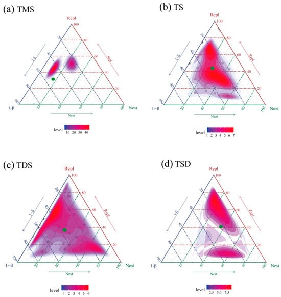 Partitioning of beta diversity in tenebrionid beetle communities across four grassland types. Note: Ternary plots visualize beta diversity and its two components for four grassland types. Green dots represent mean values for each grassland, while panels illustrate the relationship between the two partitioned components (Repl vs. Nest) for TMS, TS, TDS, and TSD, respectively. (a) TMS is temperate meadow steppe. (b) TS is temperate steppe. (c) TDS is temperate desert steppe. (d) TSD is temperate steppe desert.