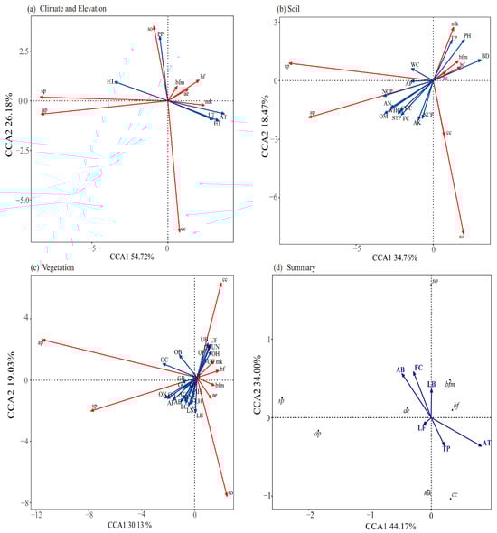 CCA ordination diagram illustrating environmental factors influencing tenebrionid beetle community composition. Notes: (a–d) Red arrows: Relative abundance of dominant tenebrionid species. Blue arrows: Environmental variables; sp is Scytosoma pygmaeum, cc is Cyphogenia chinensis, ap is Anatolica potanini, bf is Blaps femoralis, bfm is B. femoralis medusula, ae is A. ebenina, mk is Microdera kraatzi, and so is Scytosoma opaca. (a) Climate and Elevation: EL is elevation (m), PP is precipitation (mm), AT is mean daily temperature (°C), HT is maximum daily temperature (°C), and LT is minimum daily temperature (°C). (b) Soil: BD is soil bulk density, WHC is saturated water holding capacity, CHC is capillary water holding capacity, FC is field water holding capacity, NCP is non-capillary porosity, SCP is capillary porosity, STP is total porosity, OM is organic matter, PH is soil pH, AK is available potassium, TP is total soil phosphorus, AN is alkali hydrolyzable nitrogen, AP is available phosphorus, and WC is soil water content. (c) Vegetation: Gramineae: GC is Gramineae cover, GF is Gramineae frequency, GB is Gramineae biomass, GH is Gramineae height, GN is Gramineae species number, LC is Leguminosae cover, LF is Leguminosae frequency, LB is Leguminosae biomass, LH is Leguminosae height, and LN is Leguminosae species number. Asteraceae: AC is Asteraceae cover, AF is Asteraceae frequency, AB is Asteraceae biomass, AH is Asteraceae height, and AN1 is Asteraceae species number. UC is shrub cover, UF is shrub frequency, UB is shrub biomass, UH is shrub height, and UN is shrub species number. OC is other plant cover, OF is other plant frequency, OB is other plant biomass, OH is other plant height, and ON is other plant species number. (d) Filtered variables: CCA of dominant species vs. screened variables (see main text).