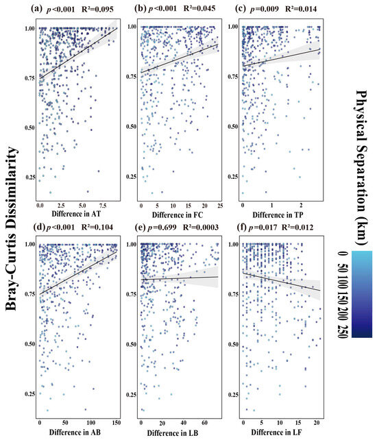 Mantel test scatterplots of Bray–Curtis distance correlations with environmental factors. Note: (a–f) display Mantel test results between tenebrionid community beta diversity. Darker scatter points indicate greater geographical distance between sample pairs. Similar colors denote spatially proximate sample pairs. (a) Mean temperature (AT). (b) Field water holding capacity (FC). (c) Total soil phosphorus (TP). (d) Asteraceae biomass (AB). (e) Leguminosae biomass (LB). (f) Leguminosae frequency (LF).