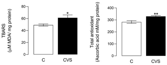 For this analysis, a complete testicle extract was used to measure oxidative stress as the TBARS content [t (1,14) = 2.110; p = 0.0533] and total antioxidant status [t (1,14) = 0.7560; p = 0.4622] were not statistically significant in the CVS group compared to the control group (see Figure 1).