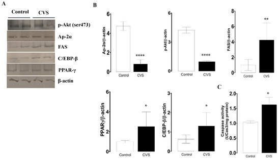 As the levels of phosphorylate p-Akt protein decrease, the protein levels of AP-2α decrease, and FAS increases; both changes were significant between the control and CVS group [t (1,10) = 10.81, p = <0.0001; t (1,10) = 17.32, p < 0.0001; t (1,10) = 3.927, p = 0.0015; respectively]. In Figure 4B,C, it is shown that the expressions of PPAR-γ and C/EBP-β were higher in the epididymal sperm extract of the CVS group compared to the control group [t (1,10) = 2.984, p = 0.0124] and C/EBP-β [t (1,10) = 2.638, p = 0.0195], respectively. The caspase-3 activity increased significantly in the epididymal sperm extracts of the CVS group [t (1,14) = 2.188, p < 0.05] vs. the control group, as shown in Figure 4C.