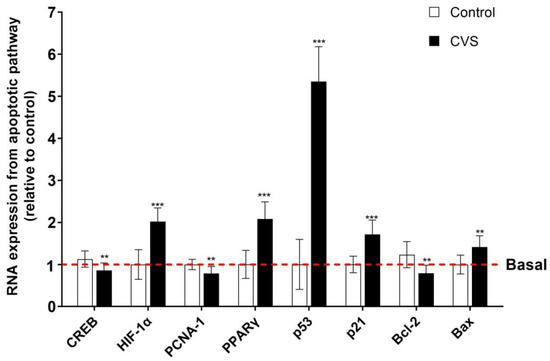 Expression of apoptotic markers in the epididymal sperm extract of rats exposed to CVS. Total RNA was extracted, and the relative mRNA expressions of p53, p21, PCNA-1, PPAR-γ, HIF-1α, Bax, Bcl-2, and CREB were detected by quantitative RT-PCR. A t-test was performed, and bars represent mean ± SE values by duplicate determination. ** p < 0.01, *** p < 0.001 vs. control group (n = 6). Chronic variable stress (CVS).