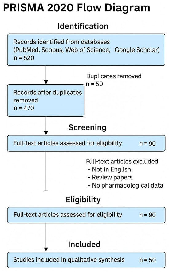 Articles were excluded if they were non-English, review papers, or lacked specific pharmacological data. Finally, 50 studies were included in the qualitative synthesis. The selection process is illustrated in the PRISMA flow diagram (Figure 1).
