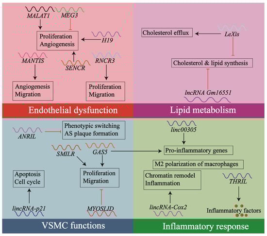 Numerous lncRNAs can regulate atherosclerosis-related processes. For instance, lncRNA MALAT1, MEG3, MANTIS, and RNCR3 modulate endothelial cell dysfunction; lincRNA-p21, SENCR, GAS5, MYOSLID, SMILR, and ANRIL regulate vascular smooth muscle cell function; linc00305, Cox2, and THRIL influence inflammatory responses; while Gm16551 and LeXis control lipid metabolism. It can be stated that lncRNAs still exhibit substantial potential in atherosclerosis research [].