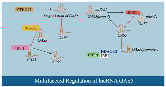 The synthesis and functional roles of the lncRNA GAS5 are governed by a multitude of factors (Figure 2). Its expression is notably influenced by cellular state, with GAS5 accumulating in growth-arrested cells, a condition inducible by serum starvation, protein translation inhibitors, or cell–cell contact inhibition []. Dysregulation of GAS5 expression is frequently observed in various pathologies; for instance, it is often downregulated in many cancer types [] and exhibits markedly lower serum levels in individuals with diabetes []. Studies in breast cancer cell lines and murine models have revealed that microRNA-mediated regulation also plays a significant role, as exemplified by miR-21, which directly binds to exon 4 of GAS5, leading to recruitment of the RNA-induced silencing complex (RISC) and subsequent post-transcriptional downregulation of GAS5, forming a mutually negative regulatory feedback loop [].
