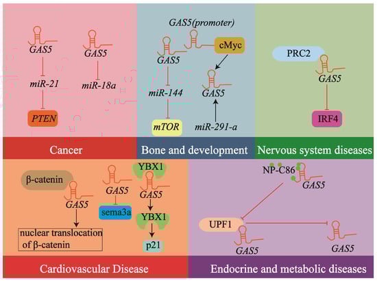 Endocrine and metabolic diseases: GAS5 is a significant factor concerning these conditions. GAS5 levels are markedly lower in serum samples from individuals diagnosed with type 2 diabetes mellitus (T2DM) and it affects insulin signaling and glucose uptake by binding to UPF1 and regulating insulin receptor expression [].