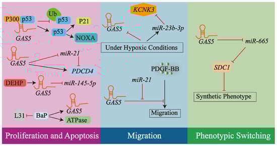 The miR-145-5p pathway: The expression of GAS5 is significantly upregulated in the aortic tissue of mice induced by di(2-ethylhexyl) phthalate (DEHP). However, further cellular experiments reveal that DEHP stimulation can induce VSMCs proliferation and promote apoptosis, during which the expression of GAS5 increases and it binds to miR-145-5p to downregulate its expression. This finding contradicts other studies, suggesting that the role of GAS5 is largely influenced by tissue type, cell type, and the context of drug stimulation []. This suggests that GAS5 may have a regulatory pattern different from the general one under specific stimuli (such as DEHP).
